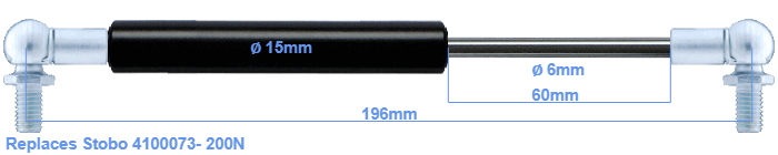 Replacement gas spring for the Stobo 4100073- 200 Newton. This fits a (possibly already present) ball with a diameter of 10mm. A corresponding ball is included. Brand: HAHN, a Stabilus company.