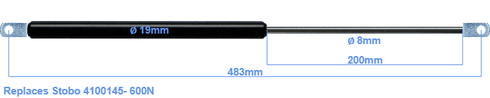 Replacement gas spring for the Stobo 4100145- 600 Newton. The eye has a thickness of 10mm and a hole diameter of 8.1mm. Brand: HAHN, a Stabilus company.