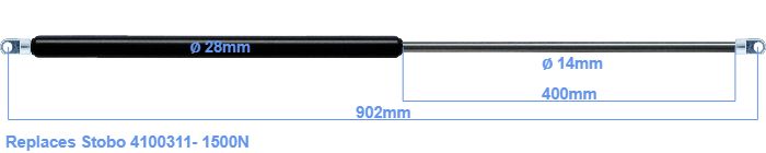 Replacement gas spring for the Stobo 4100311- 1500 Newton. The eye has a thickness of 10mm and a hole diameter of 10.1mm. Brand: HAHN, a Stabilus company.