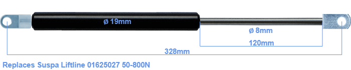 Replacement gas spring for the Suspa Liftline 01625027 50-800 Newton. Mounting part tube: The eye has a thickness of 5mm and a hole diameter of 8.1mm. Mounting part rod : The eye has a thickness of 10mm and a hole diameter of 8.1mm. Brand: HAHN, a Stabilus company.