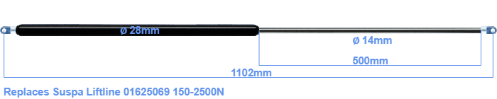 Replacement gas spring for the Suspa Liftline 01625069 150-2500 Newton. The eye has a thickness of 10mm and a hole diameter of 8.1mm. Brand: HAHN, a Stabilus company.