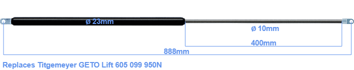 Replacement gas spring for the Titgemeyer GETO Lift 605 099 950 Newton. Mounting part tube: The eye has a thickness of 10mm and a hole diameter of 8.1mm. Mounting part rod : The eye has a thickness of 5mm and a hole diameter of 8.1mm. Brand: HAHN, a Stabilus company.