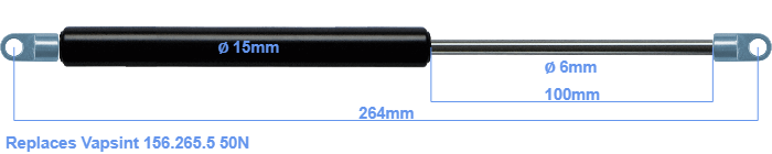 Replacement gas spring for the Vapsint 156.265.5 50 Newton. The eye has a thickness of 3mm and a hole diameter of 6.1mm. Brand: HAHN, a Stabilus company.