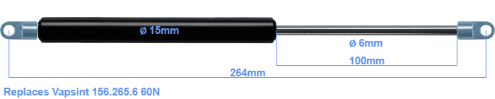 Replacement gas spring for the Vapsint 156.265.6 60 Newton. The eye has a thickness of 3mm and a hole diameter of 6.1mm. Brand: HAHN, a Stabilus company.