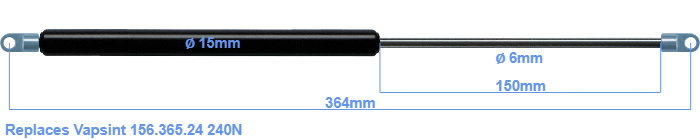 Replacement gas spring for the Vapsint 156.365.24 240 Newton. The eye has a thickness of 3mm and a hole diameter of 6.1mm. Brand: HAHN, a Stabilus company.