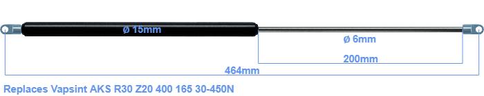 Replacement gas spring for the Vapsint AKS R30 Z20 400 165 30-450 Newton. The eye has a thickness of 3mm and a hole diameter of 6.1mm. Brand: HAHN, a Stabilus company.