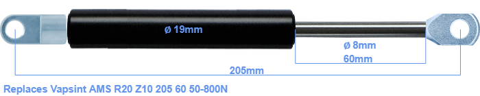 Replacement gas spring for the Vapsint AMS R20 Z10 205 60 50-800 Newton. Mounting part tube: The eye has a thickness of 5mm and a hole diameter of 8.1mm. Mounting part rod : The eye has a thickness of 10mm and a hole diameter of 8.1mm. Brand: HAHN, a Stabilus company.