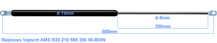 Replacement gas spring for the Vapsint AMS R20 Z10 585 250 50-800 Newton. Mounting part tube: The eye has a thickness of 5mm and a hole diameter of 8.1mm. Mounting part rod : The eye has a thickness of 10mm and a hole diameter of 8.1mm. Brand: HAHN, a Stabilus company.