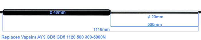 Replacement gas spring for the Vapsint AYS GD5 GD5 1120 500 300-5000 Newton. Thread: M14. Brand: HAHN, a Stabilus company.