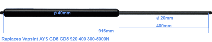 Replacement gas spring for the Vapsint AYS GD5 GD5 920 400 300-5000 Newton. Thread: M14. Brand: HAHN, a Stabilus company.